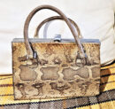 Stylish 50s vintage python snakeskin Kelly handbag with twin top handles, silver metallic frame and clasp, pull tab and four stud feet. Lined in beige suede with side slip pockets. Measures approx. 9.5” (across top) 11” (base) x 7.5” x 3.5”, in good vintage condition apart from a slightly grubby interior and some minor wear to the corners. Would also benefit from airing after long term storage.